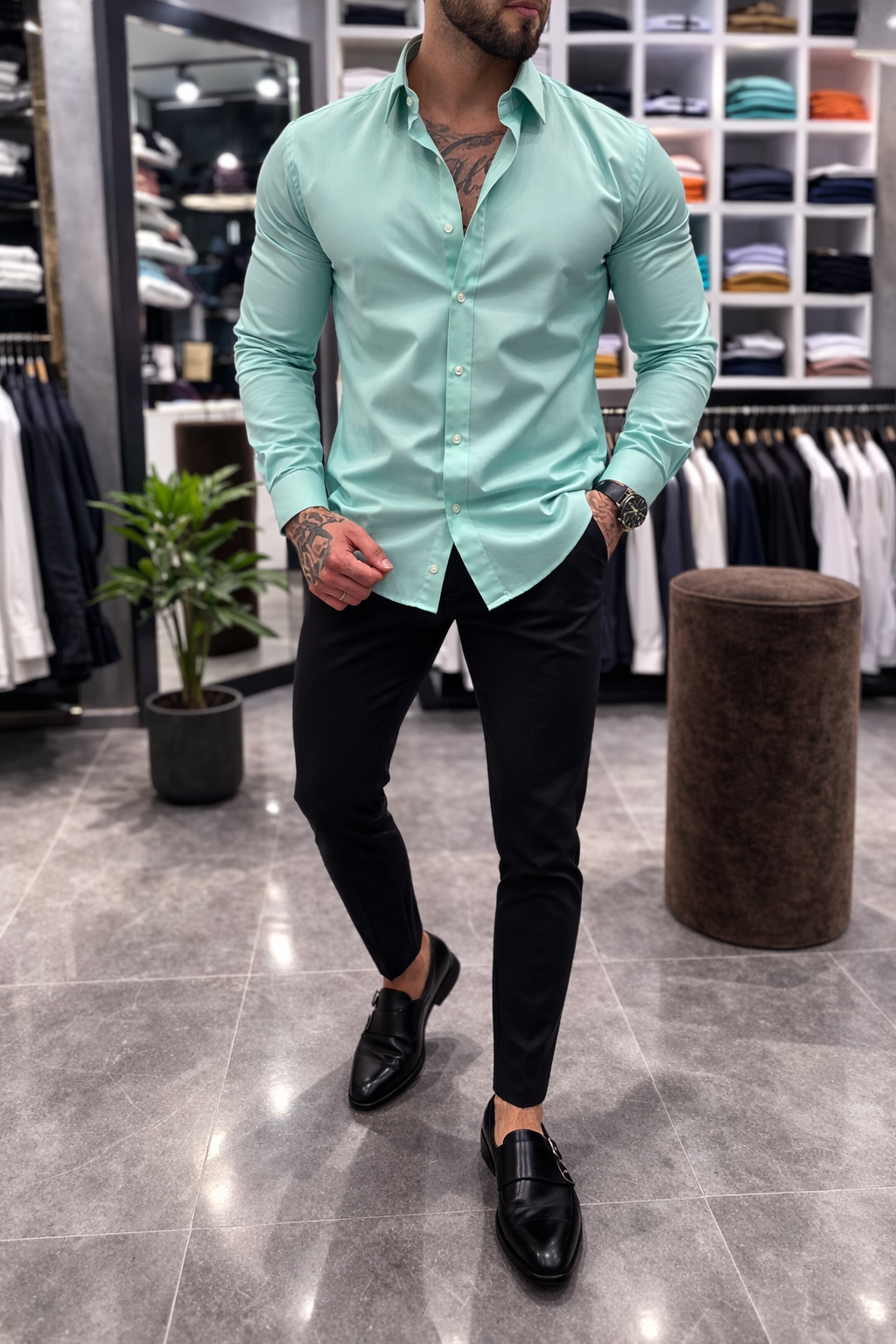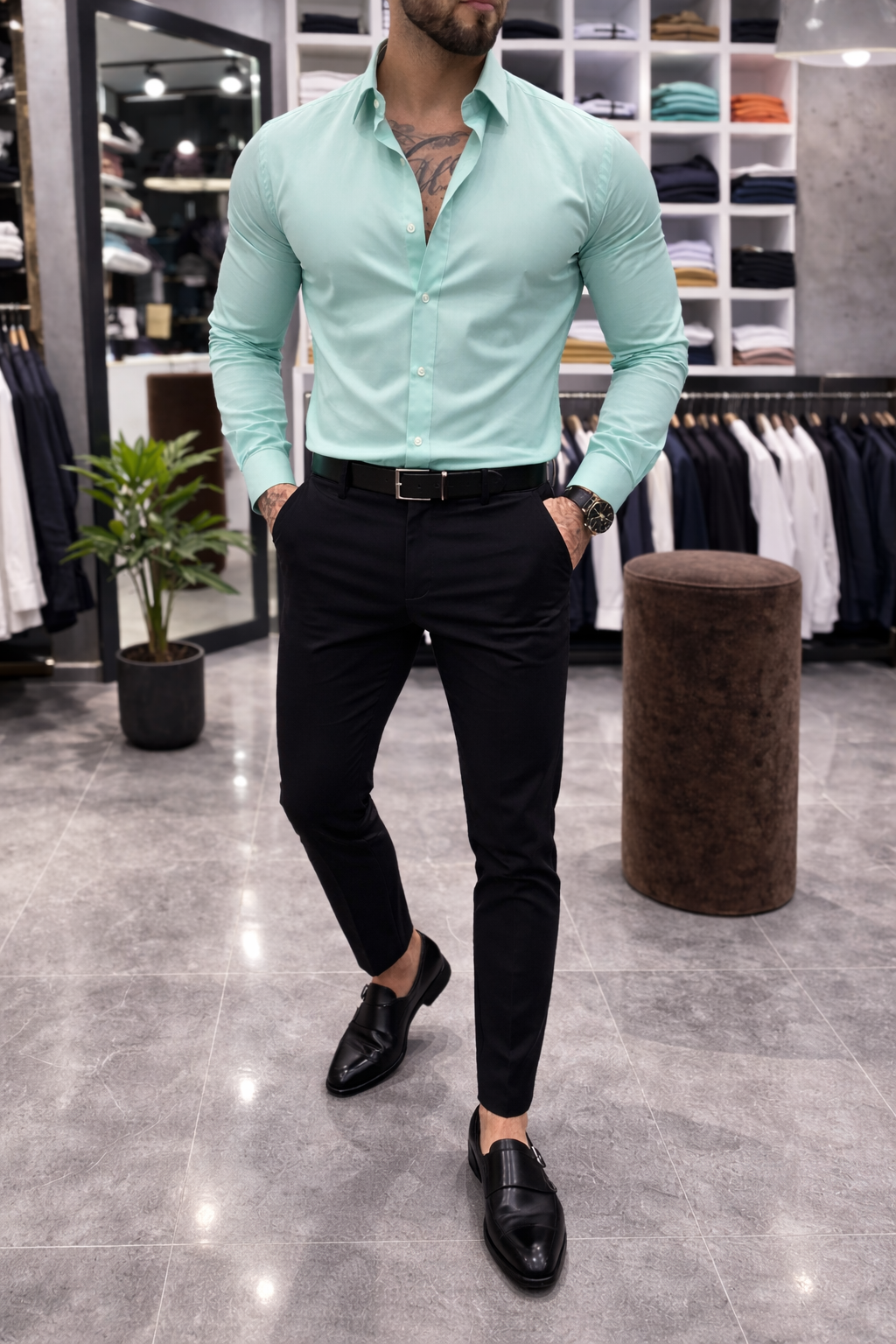 Photorealistic, dramatic studio lighting – детайлите на плата и структурата на кройката изпъкват с дълбочина и контраст, подчертавайки луксозното излъчване на модела. Риза, която комбинира съвременна естетика, мъжественост и класа в едно.
